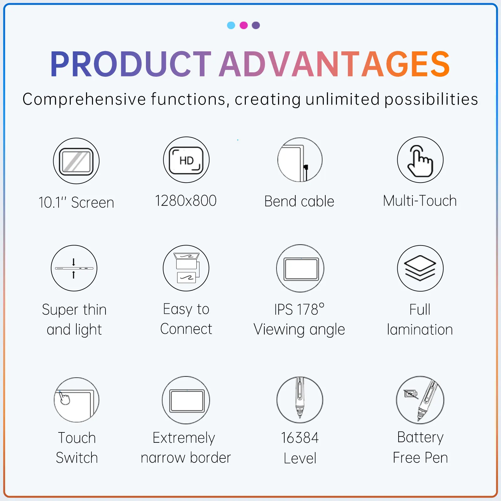 Enhanced Precision and Sensitivity: With 16384 levels of pressure sensitivity, this graphic monitor offers exceptional precision and responsiveness. Whether you're sketching, designing, or teaching online courses, the BT-101A delivers accurate and smooth pen strokes for a seamless creative process.
