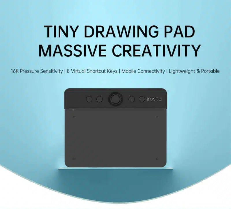 The Bosto T430K is a professional pen tablet with a compact 4 x 3 inch work area, suitable for digital illustration, graphic design, animation, digital signatures, and online education. This tablet is equipped with 16384 levels of pen pressure, tilt sensing ±60°, and 4 customizable shortcut buttons for a faster and more efficient workflow.
